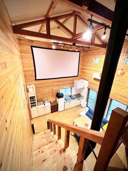 ✓壁一面の150インチ大型スクリーンと本格プロジェクター、音響設備で森の中でホームシアターを楽しめる!